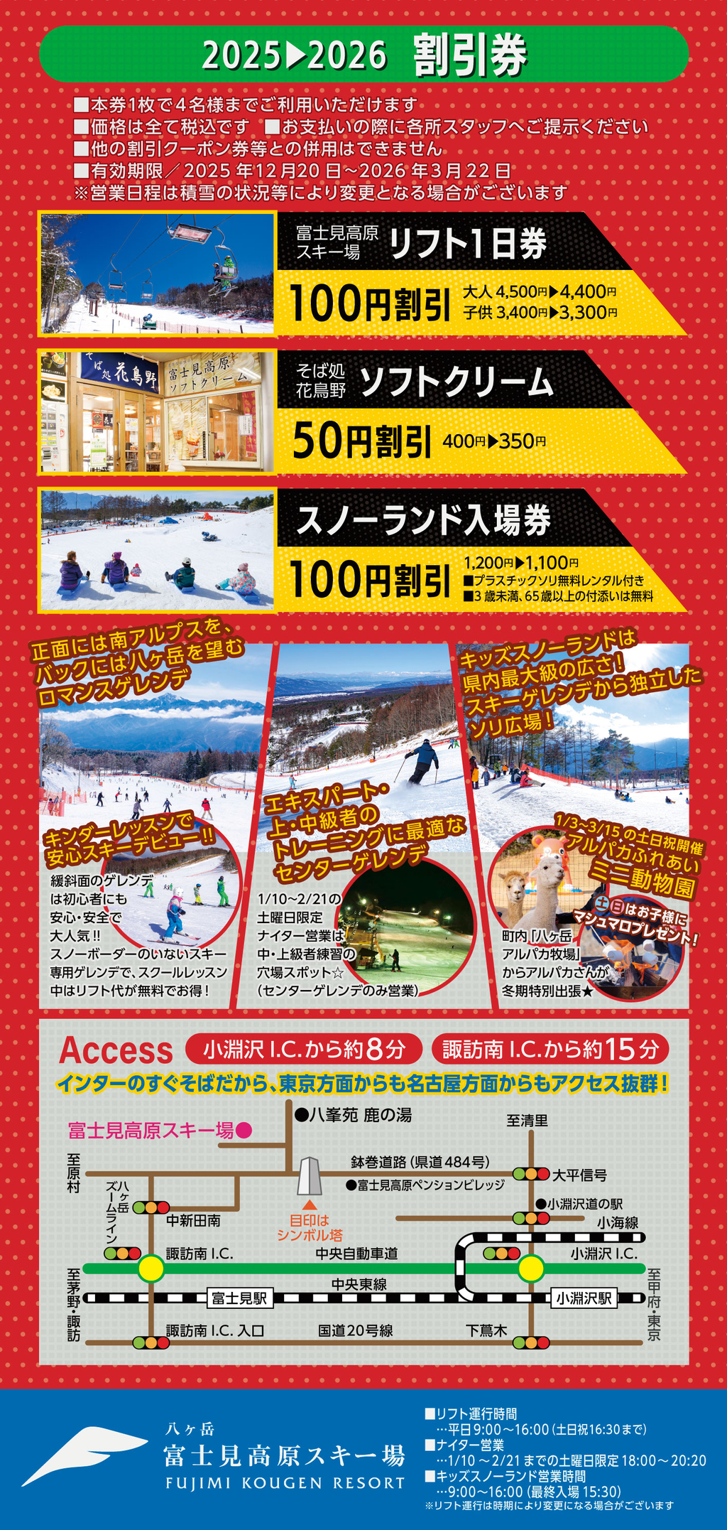 キッズパーク(キッズスノーランド)入場券の引き換えは、レストハウス券売所のみとなります。キッズパークの入場口では引き換えができませんので、あらかじめご了承ください。「スキー子どもの日」は現地で購入してください。日程はイベント情報にてご確認をお願いします